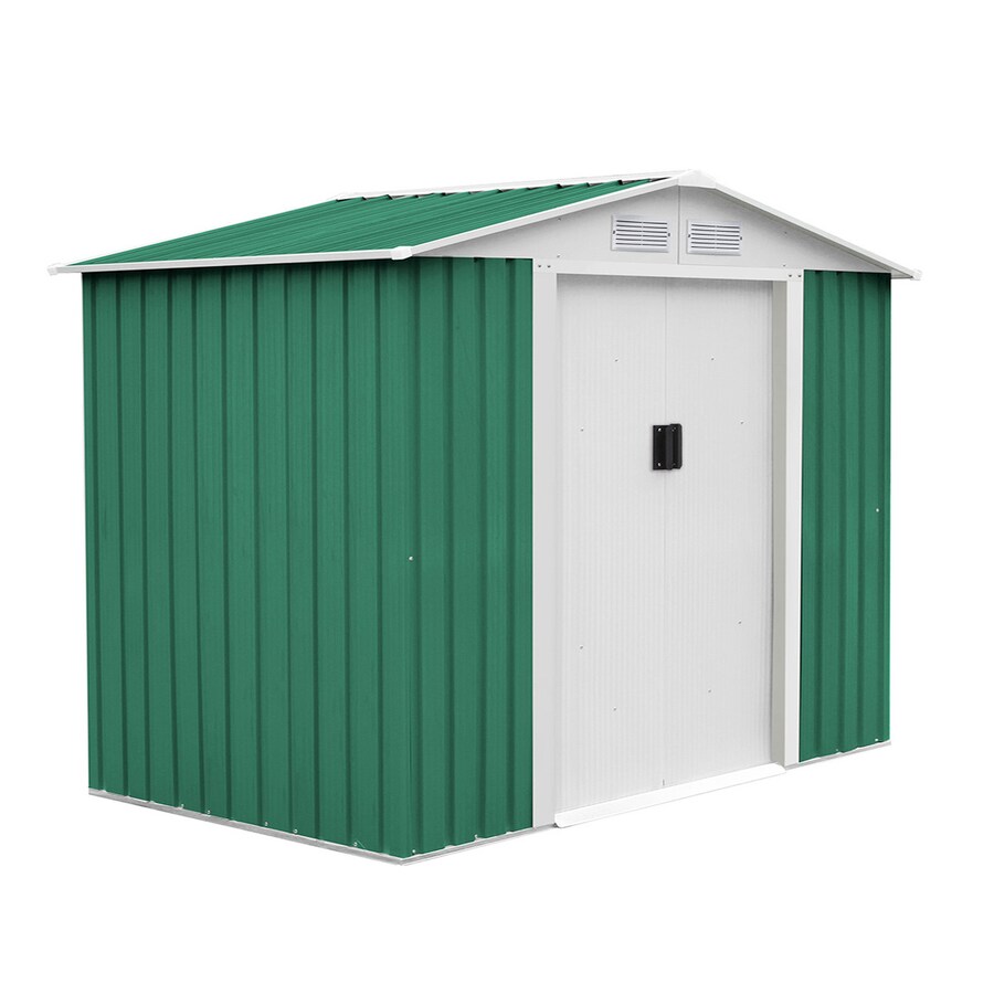 Caseta fabricada en chapa de acero galvanizado y pretintado en caliente, con doble puerta corredera con asas, paneles laterales nervados, rejillas de ventilación y tejado a dos aguas.