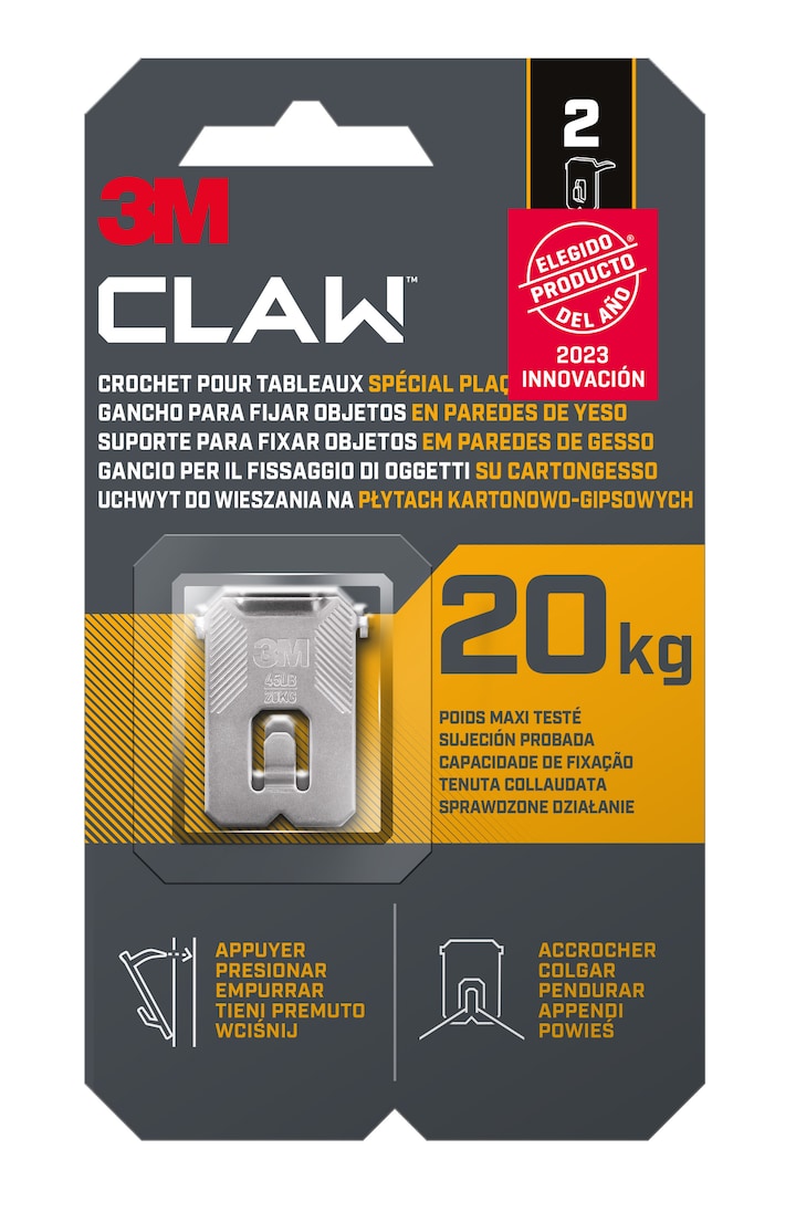 Confíe en el gancho para paredes de cartón yeso 3M CLAW™, probado para sostener hasta 20 kg.