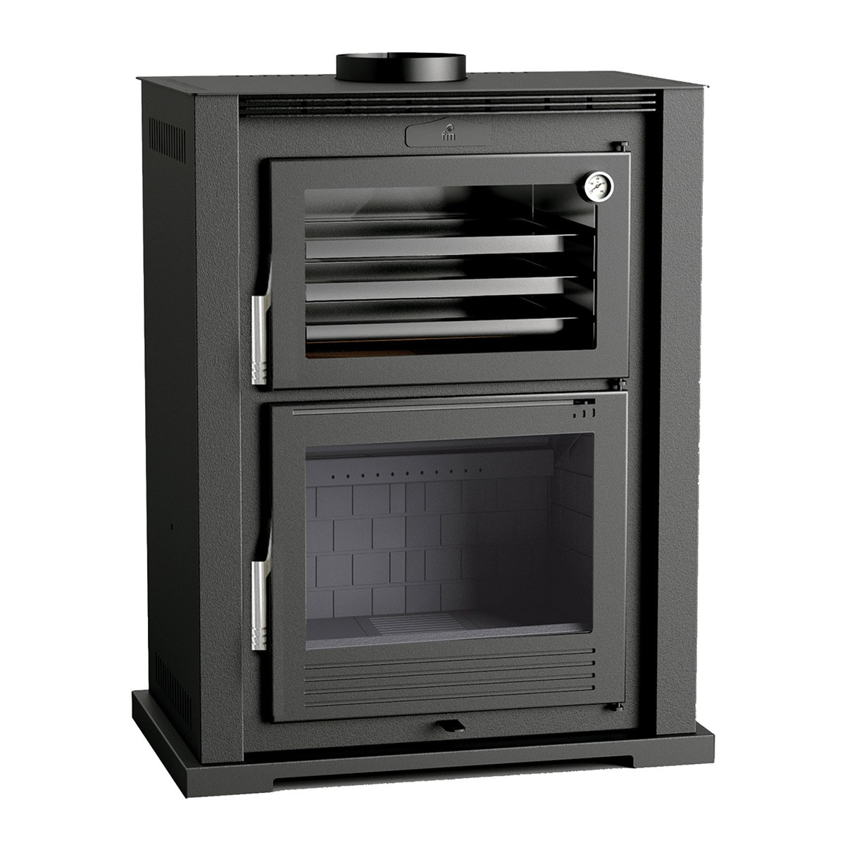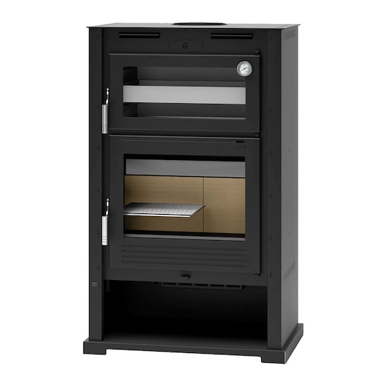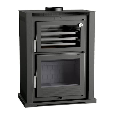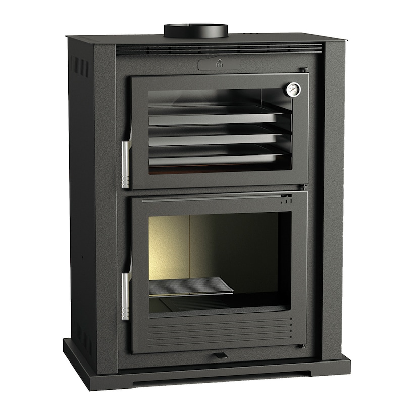 Estufa de Leña Frontal con Horno Envolvente Acero Inoxidable y Leñero M-107 T