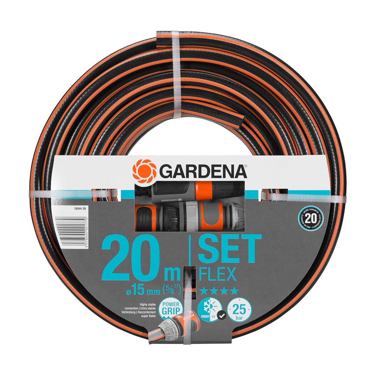 Set de manguera Flex Ø 15 mm con 20 m de manguera, lanza y accesorios de riego.