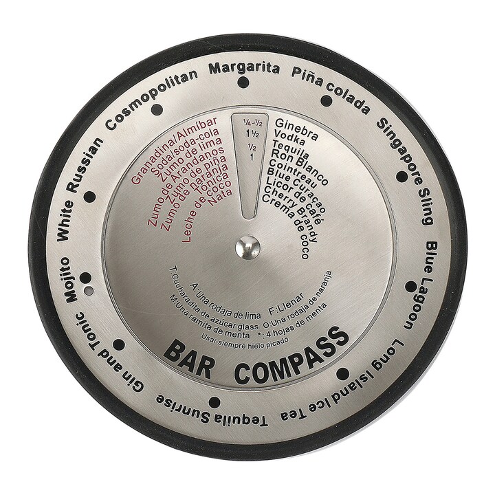 Con este original disco recetario realizado en resistente acero inoxidable, podrás preparar tus cócteles con total comodidad. Sin manchas, con un mecanismo fácil y con 10 combinados diferentes.