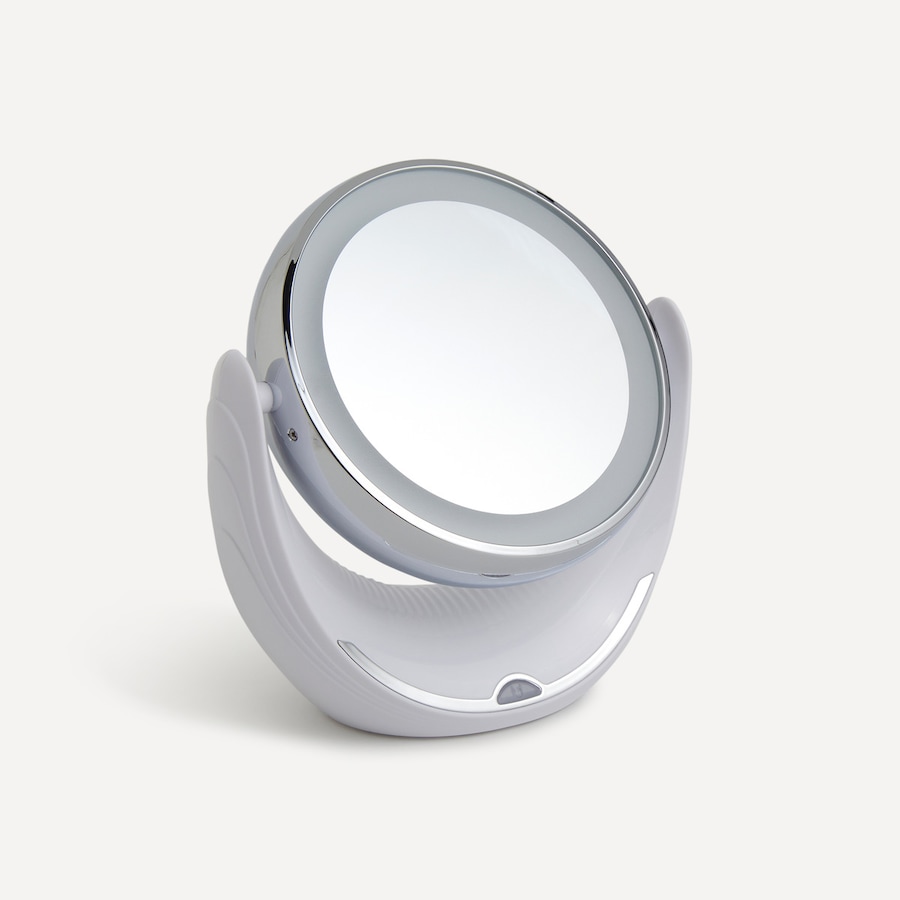 Espejo cosmético para baño para colocar sobre la encimera con doble cara: por un lado lleva espejo normal y por el otro lleva aumento x5. Además, incorpora luz LED brillante para que puedas maquillarte o realizar tus rutinas de belleza e higiene con el mayor detalle.