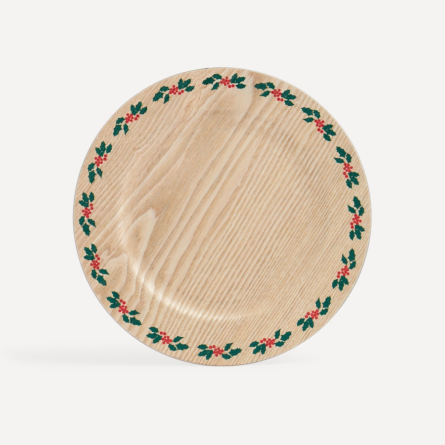 Este bajo plato de la serie Corona tiene un diseño de estilo rústico y tradicional que pondrá un toque especial a tu mesa. Está realizado en polipropileno imitación madera y alrededor del borde destaca un bonito dibujo con acebos.