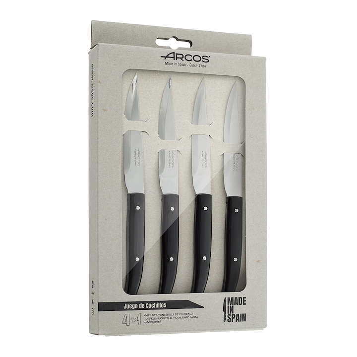 Juego de 4 cuchillos chuleteros de la serie Steak Basics de Arcos, un diseño inspirado en la navaja de Albacete y presentado en un estuche de cartón reciclado.