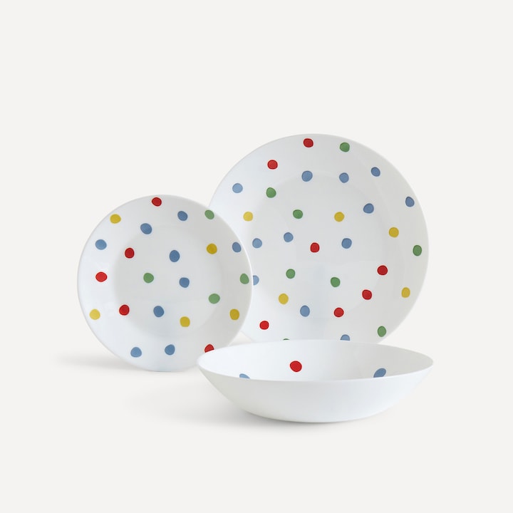 Las piezas están fabricadas en vidrio opal extra resistente, de superficie lisa y brillante, en color blanco decorado con puntos de colores. Una vajilla actual perfecta para usar a diario o para las ocasiones especiales, ya que es apta tanto para el lavavajillas como para el microondas.