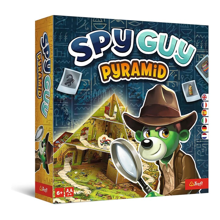 Juego colaborativo de mesa que combina estrategia y habilidad. Los jugadores ayudan a Spy Guy a proteger los tesoros de una pirámide, evitando que un adversario los robe. Incluye un tablero innovador con una pirámide en 3D. Los participantes buscan pistas y objetos misteriosos mientras trabajan en equipo para alcanzar los tesoros. Fabricado con materiales como papel, cartón y plástico.