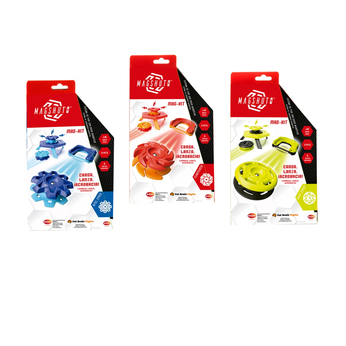 El juguete de acción y estrategia Magshuto magkit de la marca Bizak incluye un lanzador para disparar los Mag Pods, que se adhieren al Mag Module mediante un imán. El Mag Module tiene patas desplegables que permiten ajustar su inclinación y posición, facilitando la experimentación con diferentes ángulos de lanzamiento. El set incluye cartas de desafío que proponen retos por puntos, además de permitir a los jugadores crear sus propios desafíos. Está fabricado en plástico y fomenta la imaginación y el lenguaje.