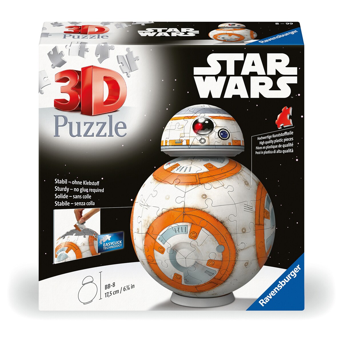 Puzzle 3D de BB8 de Star Wars de Ravensburger. Réplica detallada del droide. Permite montar la cabeza en posición vertical o inclinada. No requiere pegamento. Piezas de fibra de plástico con precisión excepcional para un ensamblaje estable. Una vez completado, se convierte en un objeto de decoración o colección.