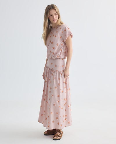 Las faldas también tienen su lugar en la colección, con diseños frescos y tejidos agradables que se adaptan a diferentes estilos. Combinadas con camisetas, tops o blusas, permiten crear conjuntos cómodos para el día a día o para ocasiones más especiales.