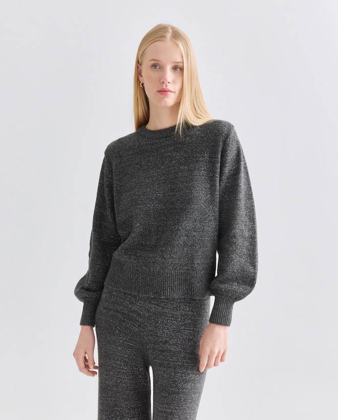 Jersey de mujer cuello caja con hilo metálico y lazada