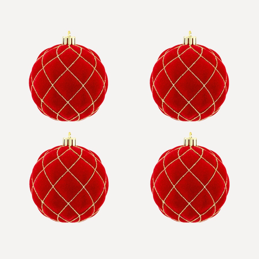 Pack de 4 bolas para colgar en el árbol, realizadas plástico flocado en diferentes colores y con patrón de rombos con efecto glitter dorado. Unos adornos para decorar tu árbol que puedes combinar con todos nuestros accesorios.