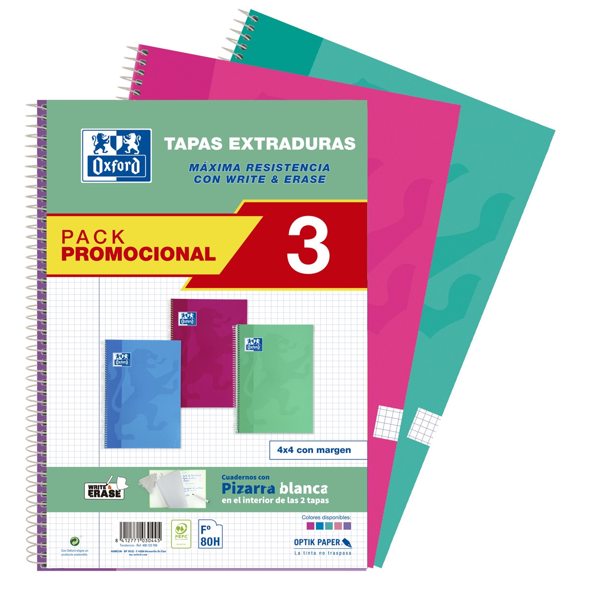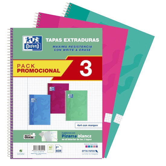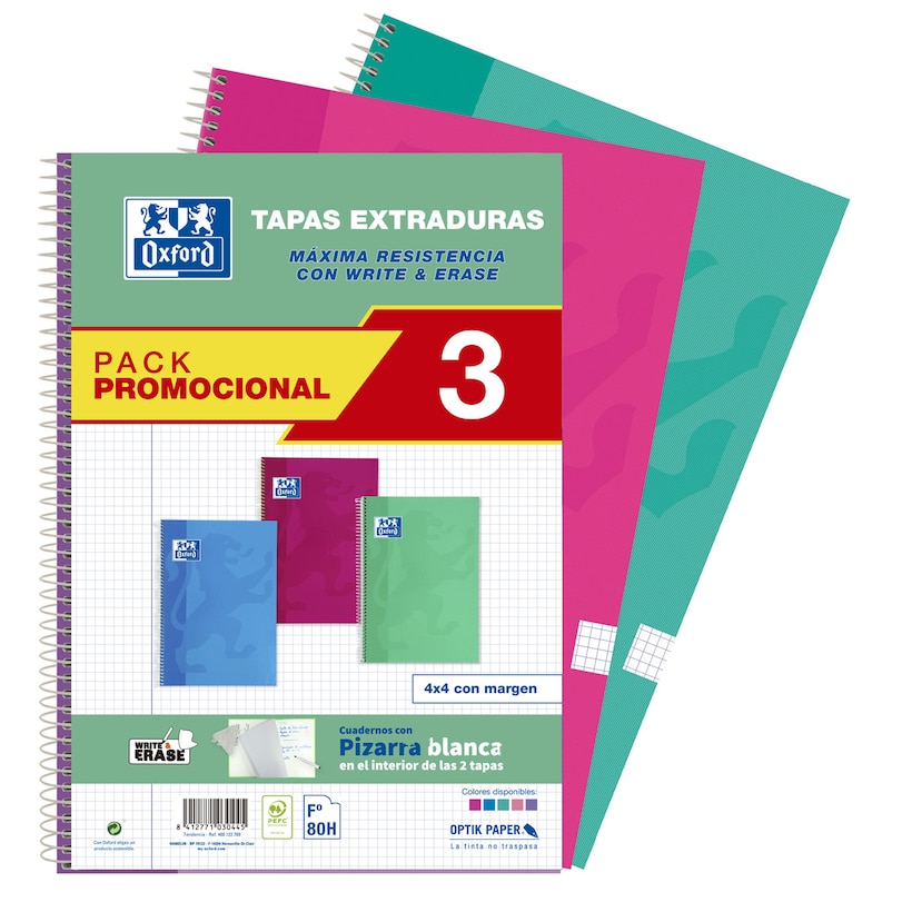 OxfordPack 3 Cuadernos Espiral A4 80 Hojas Tapa Extra Dura White&Erase Oxford Colores TendenciaAñadir