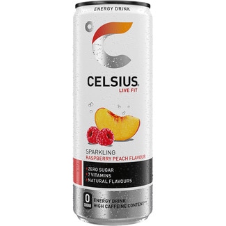 bebida energética con gas sabor frambuesa y melocotón zero azúcar y 7 vitaminas alto contenido en cafeína CELSIUS LIVE FIT