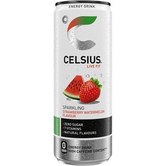 bebida energética con gas sabor fresa y sandía zero azúcar y 7 vitaminas alto contenido en cafeína CELSIUS LIVE FIT