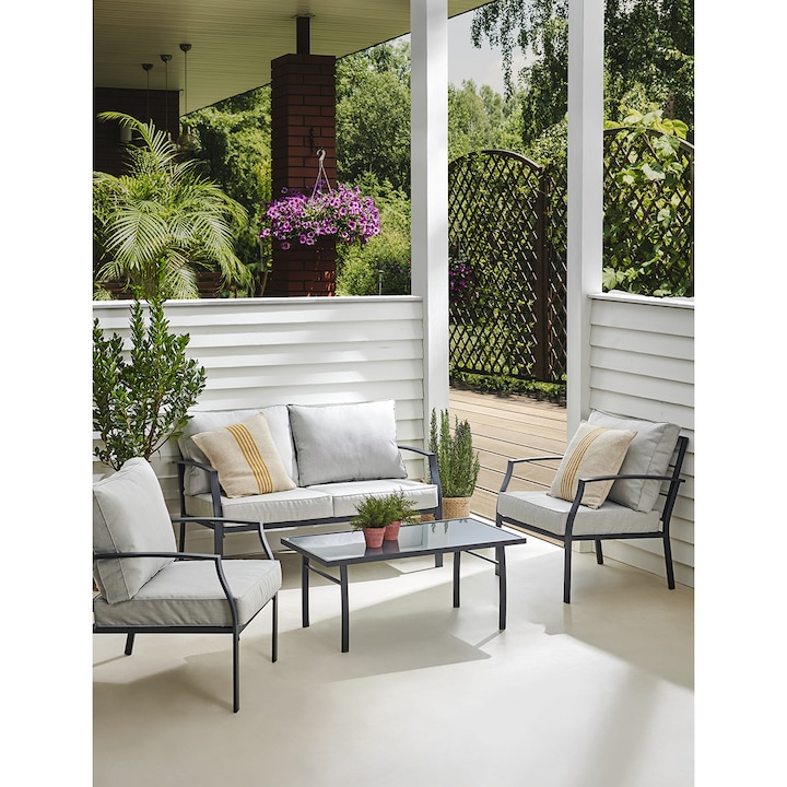 Conjunto de jardín formado por 1 sofá, 2 sillones y 1 mesa de centro. Todos son de acero, ligeros y fáciles de mover.